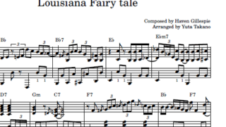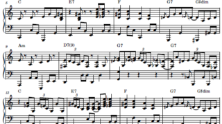 このTopsy Chapmanという歌手のことや、このバンドのことはあまり詳しくない。ただ、このクラリネットのソロは聴いていて、なんともイキで心地よいので採譜をしてみた。細かい譜割のことは大目にみてほしい。中段のFm7 - G7あたりから終...
