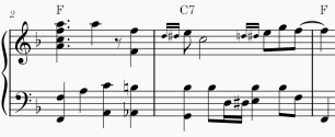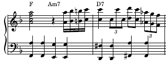 最初のFからC7のところで、Aの音を下に持ってきて、パッシングコードでAbからGをルートにしたC7にするあたりは単純だけど美しい。